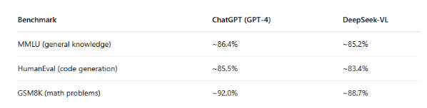 When comparing ChatGPT and DeepSeek across common AI benchmarks (like MMLU, GSM8K, and HumanEval), here's a general view: